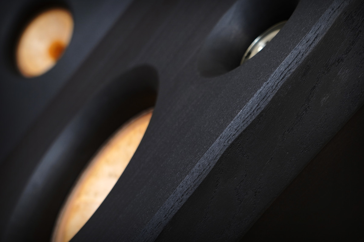 A new finish debuts on the “National Treasure” live-edge wood field coil speakers at FLAX. Given the art-school roots of Treehaus, it should be no surprise that late nights, then and now, often consist of a heavy diet of Shoegaze. Rob Dickinson, of Catherine Wheel and of Singer Vehicle Design, has provided not only the soundtrack, but also the inspiration, for how analog objects of the past can be reimagined for the future. As a loving tribute, this latest finish is called “Texture Black Metallic.” A high pigment load deep black base is applied over a grain-rich live edge plinth, then top coated with a hand-rubbed oil finish containing a fine silver metallic mica. The grain subtlety captures this silver, providing visual depth and making this black anything but ordinary.