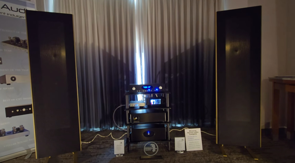 Amazingly rich and dynamic sound from this room. Rogue Audio debuted the new RP-3 balanced tube preamplifier ($3,495), a feature-rich evolution of their RP-X platform, offering flexible connectivity, home theater bypass, and sleek black or silver finishes. Paired with their flagship Stereo 100 Dark amplifier ($4,995) and Magnepan 1.7x speakers, the system delivered dynamic bass, a natural midrange, and refined detail. Components included Darwin cables, a Benchmark DAC3 B, and streamers from Aurender and Eversolo.