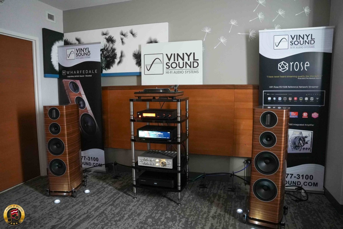 In this room: Wharfedale’s Elysian 4 speakers ($10,995) were paired with the striking Hifi Rose RA180 integrated amp ($6,995) and RS1515 streamer ($4,995), along with the MoFi MasterDeck turntable and UltraGold MC cartridge ($6,995). Power was cleaned up by the ISOTEK V5 Aquarius ($2,995) and everything rested on the handsome HIFI Rack HF-5 ($4,499).