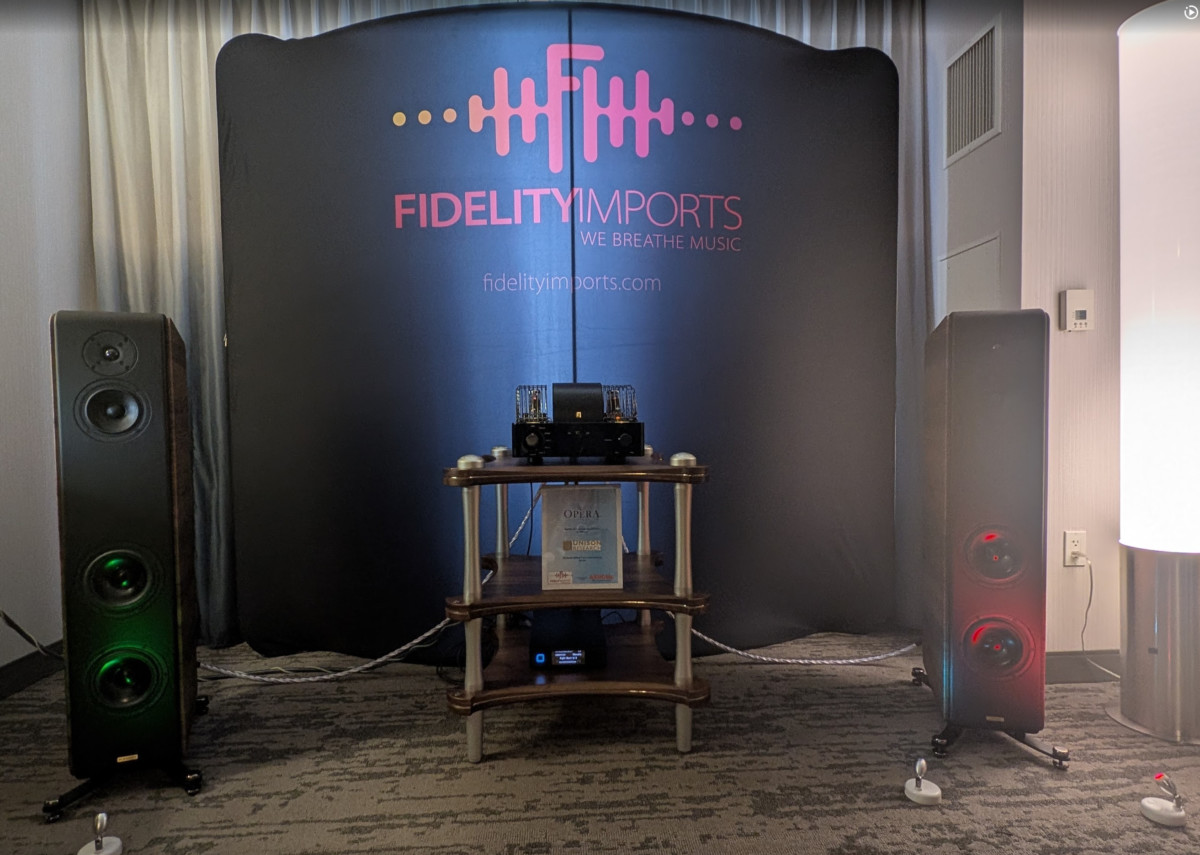 Fidelity Imports featured the new Unison Research S6 Black Edition integrated amp ($7,000) paired with the Opera Quinta v.2 loudspeakers (just under $7,000/pair). Powered by Gold Lion KT77 tubes delivering 40 watts of Class A, and sourced from an Aurender N150 into the S6’s internal DAC.